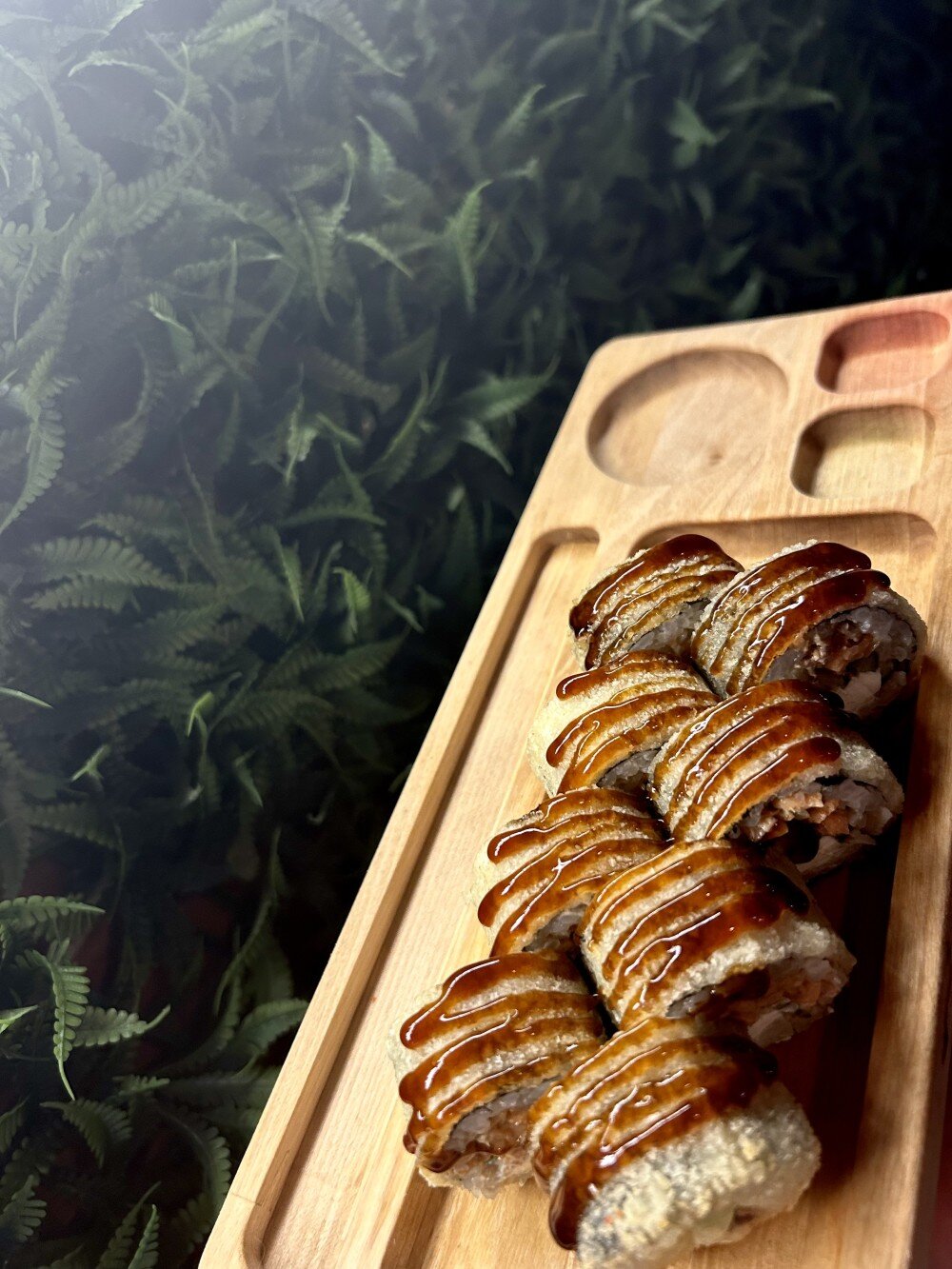Состав: сыр сливочный, огурец, жаренный лосось в соусе терияки