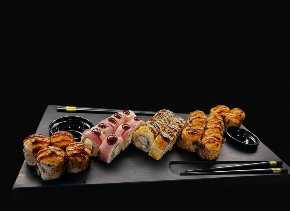 Запеченный с курицей в стружке тунца, Запеченный краб в стружке тунца, Опалённый бекон под BBQ соусом, Ролл с омлетом и крабом